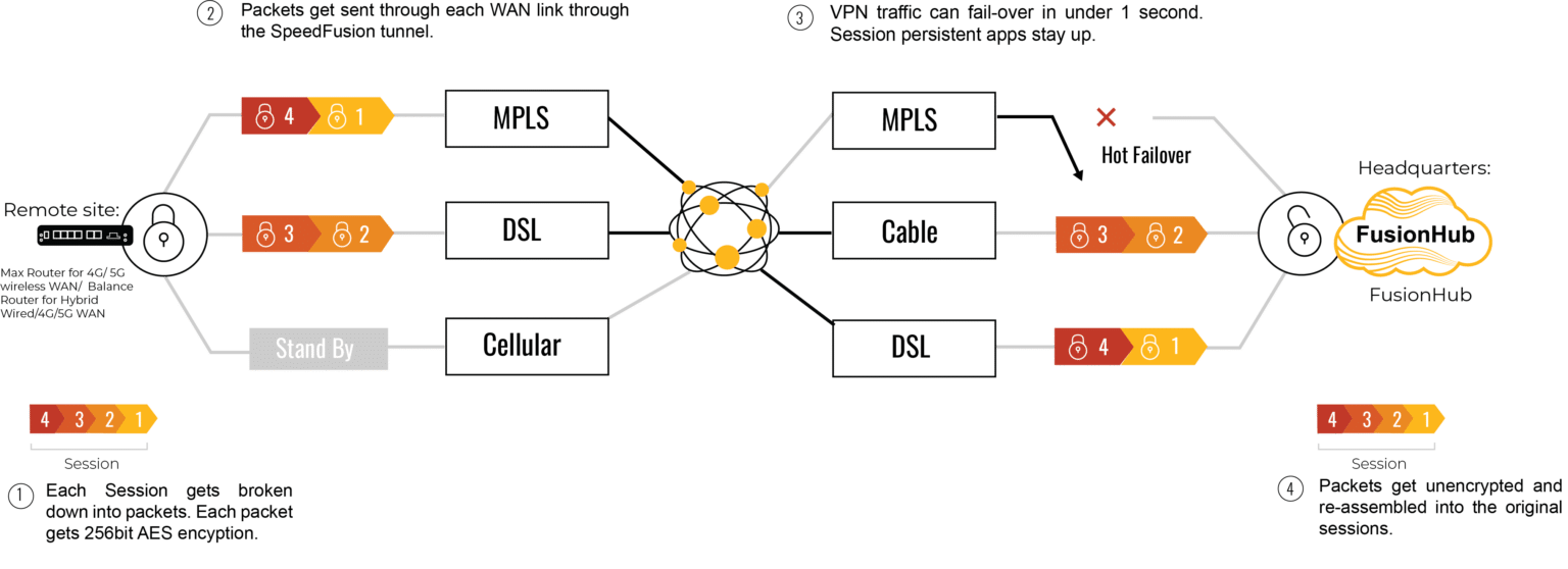 Once the bandwidth bonded SpeedFusion tunnel is formed, sessions are broken down and the resulting packets are sent separately across as available WAN-to-WAN connections. Because each WAN-to-WAN connection is encrypted separately, potential hackers would need to obtain the key to every WAN-to-WAN connection before they stand a chance of accessing the data contained within. This makes SpeedFusion SD-WAN technology virtually impervious to man-in-the-middle attacks.