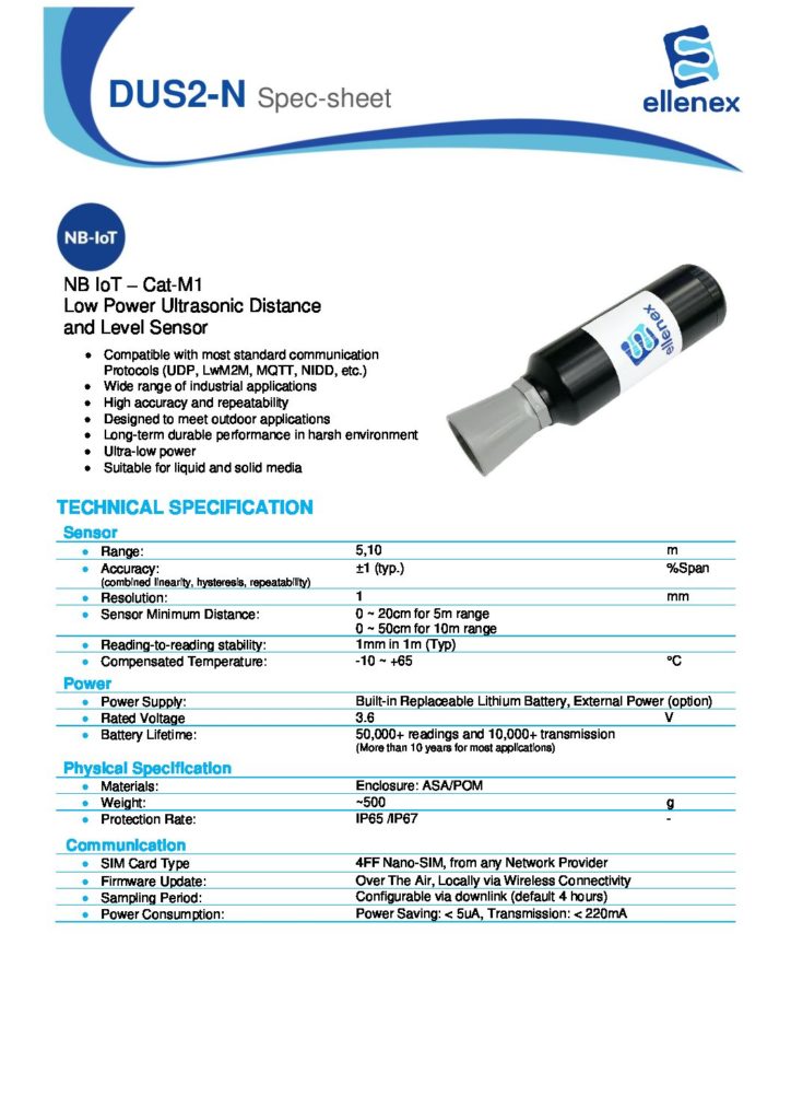 DUS2-N-Ellenex NB IoT -Cat-M1 Low Power Ultrasonic Distance Sensor 2021